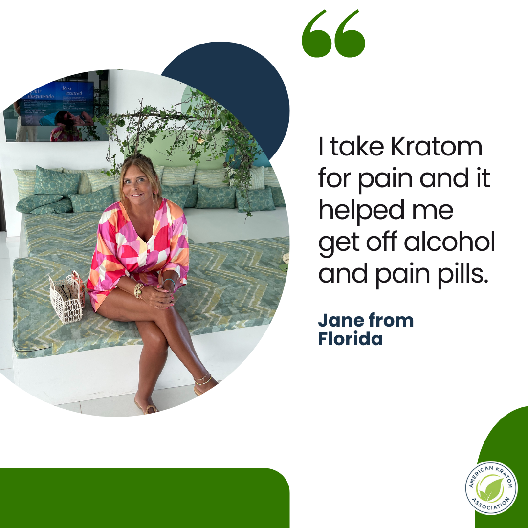 Jane from FloridaI take Kratom for pain and it helped me get off alcohol and pain pills.