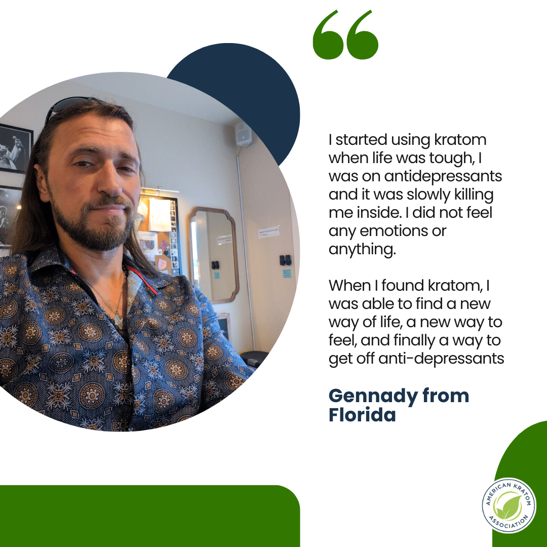 Gennady from FloridaI started using kratom when life was tough, I was on antidepressants and it was slowly killing me inside. I did not feel any emotions or anything. When I found kratom, I was able to find a new way of life, a new way to feel, and finally a way to get off anti-depressants
