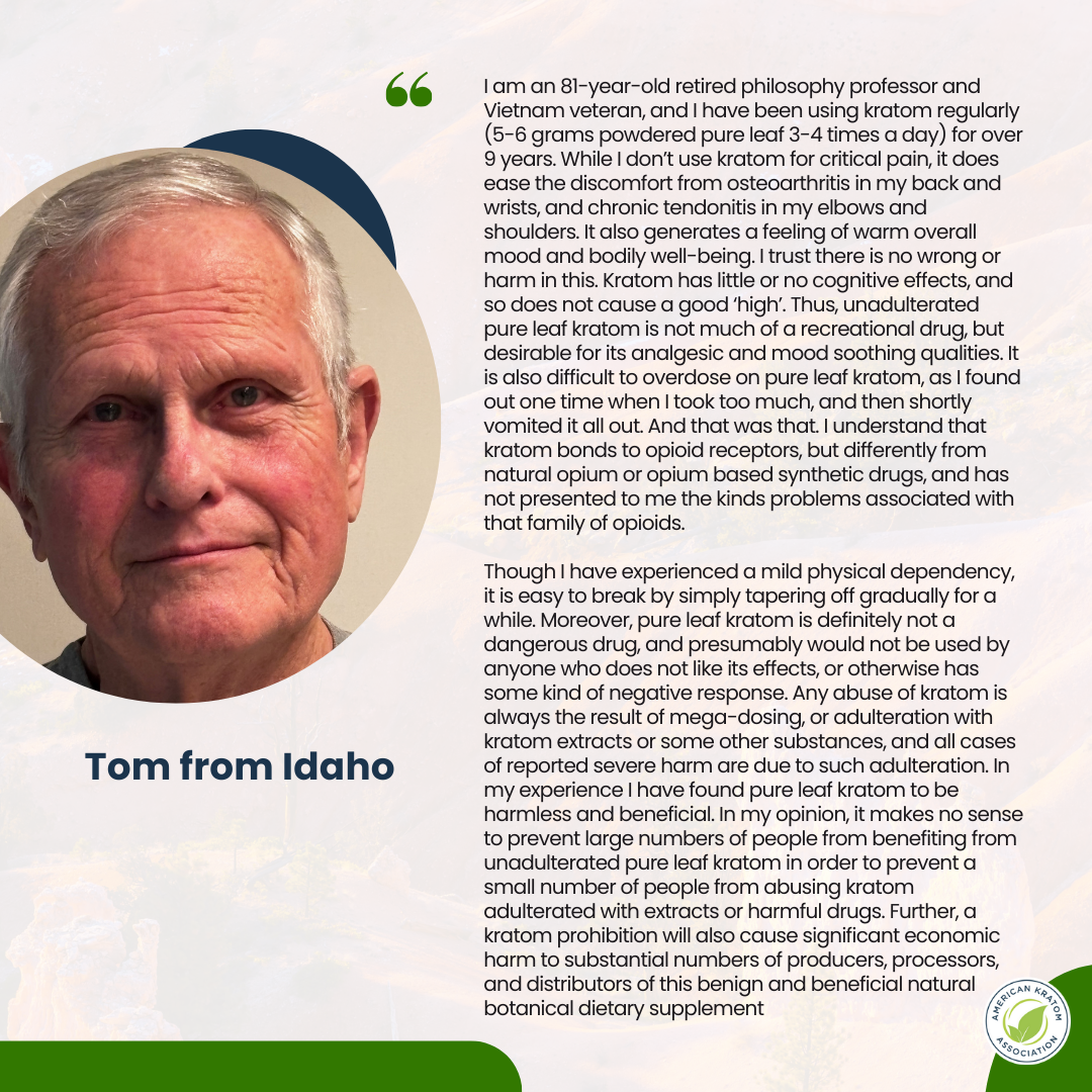 I am an 81-year-old retired philosophy professor and Vietnam veteran, and I have been using kratom regularly (5-6 grams powdered pure leaf 3-4 times a day) for over 9 years. While I don’t use kratom for critical pain, it does ease the discomfort from osteoarthritis in my back and wrists, and chronic tendonitis in my elbows and shoulders. It also generates a feeling of warm overall mood and bodily well-being. I trust there is no wrong or harm in this. Kratom has little or no cognitive effects, and so does not cause a good ‘high’. Thus, unadulterated pure leaf kratom is not much of a recreational drug, but desirable for its analgesic and mood soothing qualities. It is also difficult to overdose on pure leaf kratom, as I found out one time when I took too much, and then shortly vomited it all out. And that was that. I understand that kratom bonds to opioid receptors, but differently from natural opium or opium based synthetic drugs, and has not presented to me the kinds problems associated with that family of opioids.