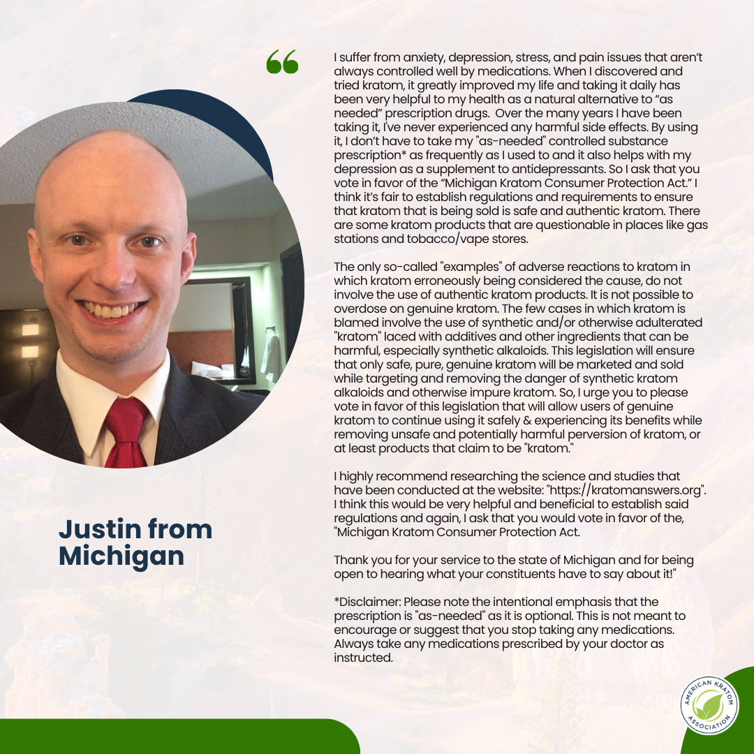 I suffer from anxiety, depression, stress, and pain issues that aren’t always controlled well by medications. When I discovered and tried kratom, it greatly improved my life and taking it daily has been very helpful to my health as a natural alternative to “as needed” prescription drugs. Over the many years I have been taking it, I've never experienced any harmful side effects. By using it, I don’t have to take my "as-needed" controlled substance prescription* as frequently as I used to and it also helps with my depression as a supplement to antidepressants. So I ask that you vote in favor of the “Michigan Kratom Consumer Protection Act.” I think it’s fair to establish regulations and requirements to ensure that kratom that is being sold is safe and authentic kratom. There are some kratom products that are questionable in places like gas stations and tobacco/vape stores.