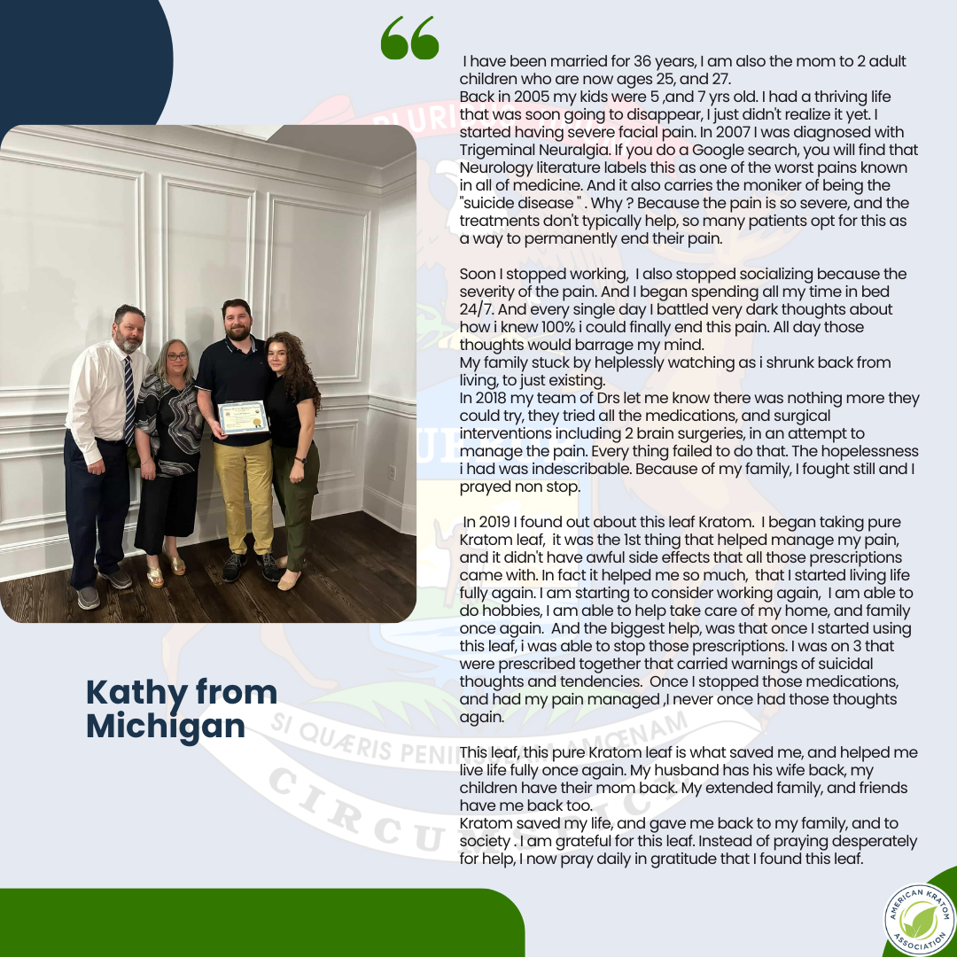 "Hello. I am a 57-year-old woman who has had my share of struggles with addiction. I have been through both inpatient and outpatient programs and have frankly found little long-term success with either. It was only when I began using kratom in 2018 that I was able to successfully manage my addiction, avoid opioid use completely, and focus on my life goals. I have since completed my bachelor’s degree at Western Illinois University and am one semester away from completing my master’s at Michigan State University. Kratom, when used successfully is life-changing. I do not experience a “high” when I use it but have only gained a sense of control over any cravings. I currently take a low dosage for maintenance and have had no compulsion to turn back to opioids. Losing access to kratom could have a potentially devastating, life-altering impact on those individuals who have found freedom from addiction and new hope for their lives through its use. Please consider the science of kratom, not the provocative talking points of those who either have no true experience with it or pharmaceutical operatives who feel threatened by its availability to the public."