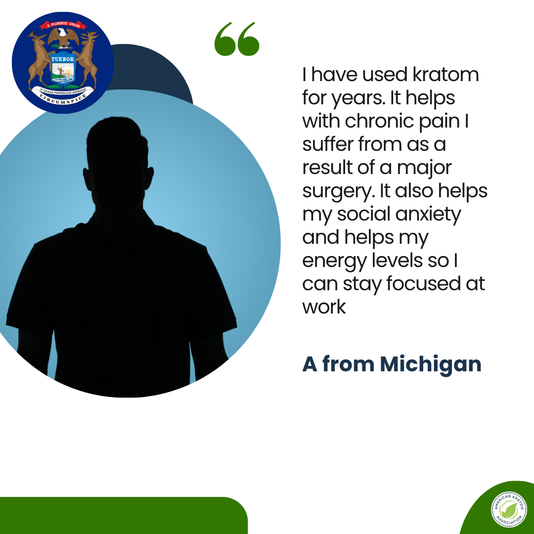 A from MichiganI have used kratom for years. It helps with chronic pain I suffer from as a result of a major surgery. It also helps my social anxiety and helps my energy levels so I can stay focused at work