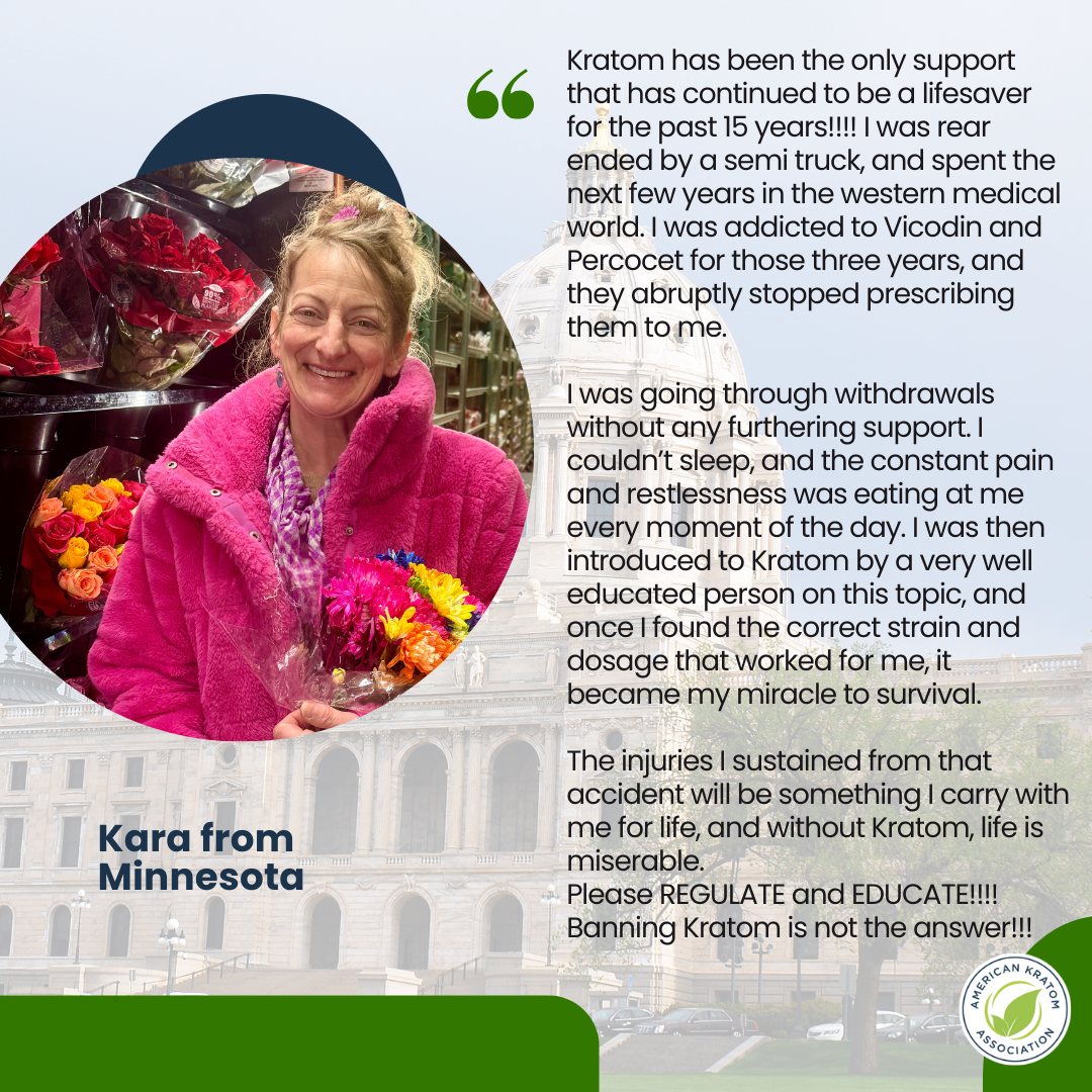 “As a Minnesotan and a Marine Corps Veteran, I have health problems to say the least. Kratom gives me the opportunity everyday to stand back up, to be able to take care of my fiancée and my home. It is a medicine, like many other herbs and plants around the world, like Devil's Claw, another herb I use; these medicines deserve respect. Please protect this beautiful plant, it's keeping so many people alive.”