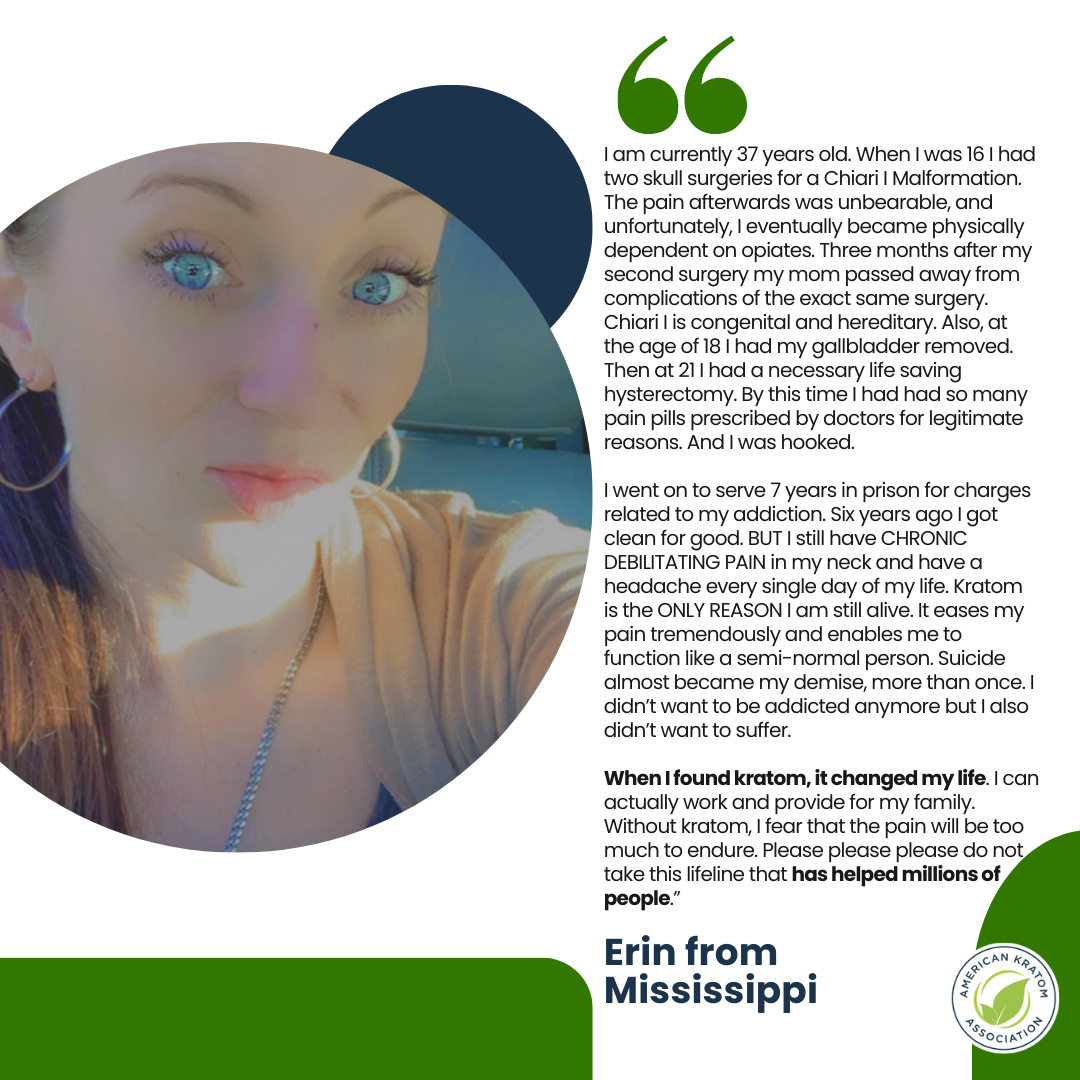Erin from Mississippi“I am currently 37 years old. When I was 16 I had two skull surgeries for a Chiari I Malformation. The pain afterwards was unbearable, and unfortunately, I eventually became physically dependent on opiates. Three months after my second surgery my mom passed away from complications of the exact same surgery. Chiari I is congenital and hereditary. Also, at the age of 18 I had my gallbladder removed. Then at 21 I had a necessary life saving hysterectomy. By this time I had had so many pain pills prescribed by doctors for legitimate reasons. And I was hooked. I went on to serve 7 years in prison for charges related to my addiction. Six years ago I got clean for good. BUT I still have CHRONIC DEBILITATING PAIN in my neck and have a headache every single day of my life. Kratom is the ONLY REASON I am still alive. It eases my pain tremendously and enables me to function like a semi-normal person. Suicide almost became my demise, more than once. I didn’t want to be addicted anymore but I also didn’t want to suffer. When I found kratom, it changed my life. I can actually work and provide for my family. Without kratom, I fear that the pain will be too much to endure. Please please please do not take this lifeline that has helped millions of people.”