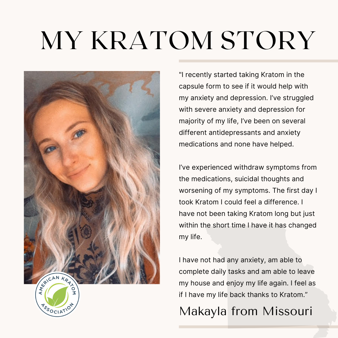 "I recently started taking Kratom in the capsule form to see if it would help with my anxiety and depression. I’ve struggled with severe anxiety and depression for majority of my life, I’ve been on several different antidepressants and anxiety medications and none have helped. I’ve experienced withdraw symptoms from the medications, suicidal thoughts and worsening of my symptoms. The first day I took Kratom I could feel a difference. I have not been taking Kratom long but just within the short time I have it has changed my life. I have not had any anxiety, am able to complete daily tasks and am able to leave my house and enjoy my life again. I feel as if I have my life back thanks to Kratom.”