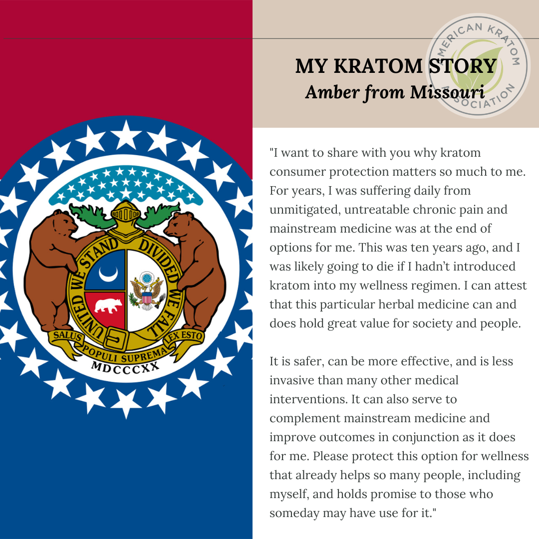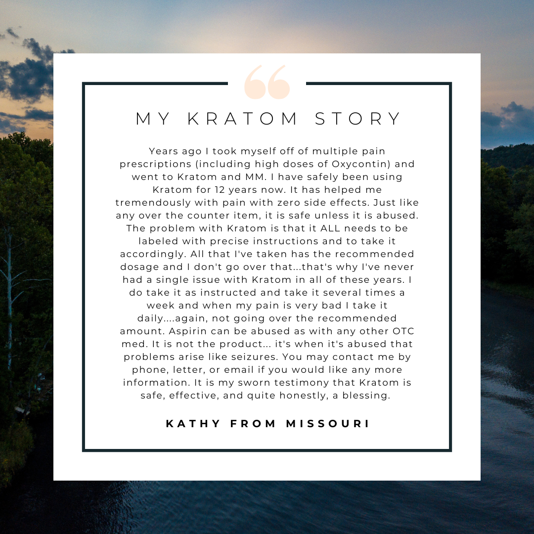 "I want to share with you why kratom consumer protection matters so much to me. For years, I was suffering daily from unmitigated, untreatable chronic pain and mainstream medicine was at the end of options for me. This was ten years ago, and I was likely going to die if I hadn’t introduced kratom into my wellness regimen. I can attest that this particular herbal medicine can and does hold great value for society and people. It is safer, can be more effective, and is less invasive than many other medical interventions. It can also serve to complement mainstream medicine and improve outcomes in conjunction as it does for me. Please protect this option for wellness that already helps so many people, including myself, and holds promise to those who someday may have use for it."