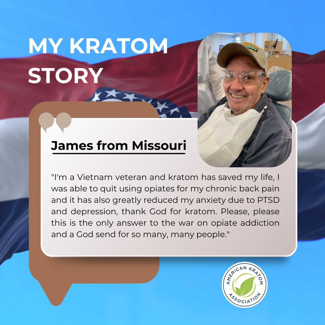 "I'm a Vietnam veteran and kratom has saved my life, I was able to quit using opiates for my chronic back pain and it has also greatly reduced my anxiety due to PTSD and depression, thank God for kratom. Please, please this is the only answer to the war on opiate addiction and a God send for so many, many people."