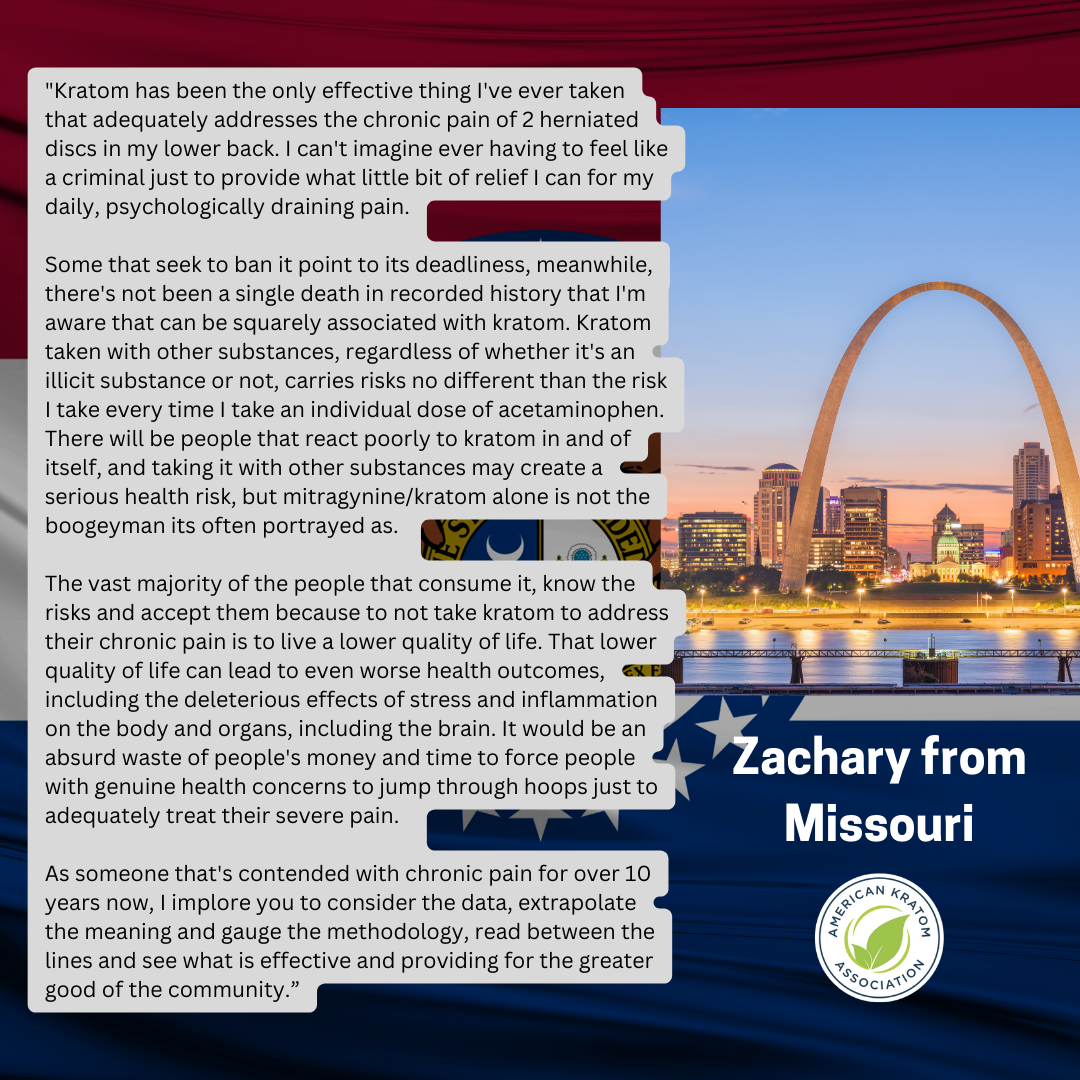 "Kratom has been the only effective thing I've ever taken that adequately addresses the chronic pain of 2 herniated discs in my lower back. I can't imagine ever having to feel like a criminal just to provide what little bit of relief I can for my daily, psychologically draining pain. Some that seek to ban it point to its deadliness, meanwhile, there's not been a single death in recorded history that I'm aware that can be squarely associated with kratom. Kratom taken with other substances, regardless of whether it's an illicit substance or not, carries risks no different than the risk I take every time I take an individual dose of acetaminophen. There will be people that react poorly to kratom in and of itself, and taking it with other substances may create a serious health risk, but mitragynine/kratom alone is not the boogeyman its often portrayed as. The vast majority of the people that consume it, know the risks and accept them because to not take kratom to address their chronic pain is to live a lower quality of life. That lower quality of life can lead to even worse health outcomes, including the deleterious effects of stress and inflammation on the body and organs, including the brain. It would be an absurd waste of people's money and time to force people with genuine health concerns to jump through hoops just to adequately treat their severe pain. As someone that's contended with chronic pain for over 10 years now, I implore you to consider the data, extrapolate the meaning and gauge the methodology, read between the lines and see what is effective and providing for the greater good of the community.”