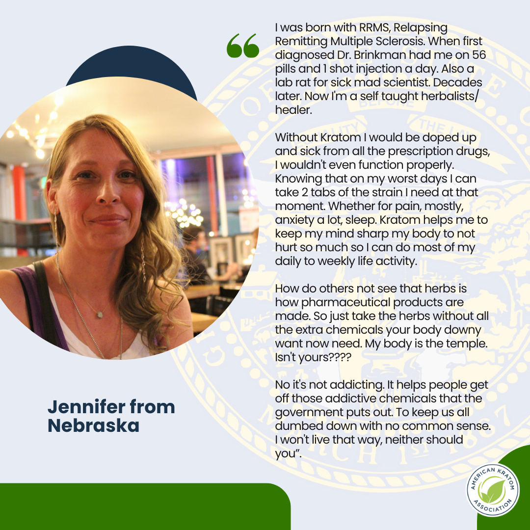 “I don't remember the state of Nebraska doing anything to stop my doctor at the time from prescribing Xanax to me for 8 years. Kratom actually allowed me to get off that garbage. Keep in mind that just like anything else, if you make it illegal, people will just obtain it the illegal way. This is why gun laws won't work and why the government has never made any progress in the war on drugs. If you make a non-drug illegal, it will have zero meaningful effect.”