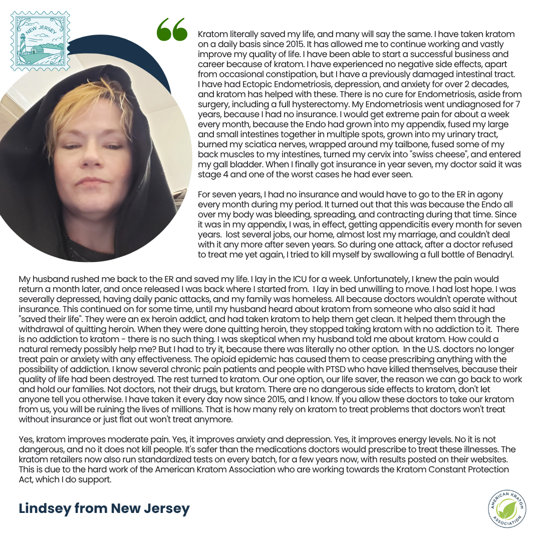 Lindsey from NJ“Kratom literally saved my life, and many will say the same. I have taken kratom on a daily basis since 2015. It has allowed me to continue working and vastly improve my quality of life. I have been able to start a successful business and career because of kratom. I have experienced no negative side effects, apart from occasional constipation, but I have a previously damaged intestinal tract. I have had Ectopic Endometriosis, depression, and anxiety for over 2 decades, and kratom has helped with these. There is no cure for Endometriosis, aside from surgery, including a full hysterectomy. My Endometriosis went undiagnosed for 7 years, because I had no insurance. I would get extreme pain for about a week every month, because the Endo had grown into my appendix, fused my large and small intestines together in multiple spots, grown into my urinary tract, burned my sciatica nerves, wrapped around my tailbone, fused some of my back muscles to my intestines, turned my cervix into "swiss cheese", and entered my gall bladder. When I finally got insurance in year seven, my doctor said it was stage 4 and one of the worst cases he had ever seen. For seven years, I had no insurance and would have to go to the ER in agony every month during my period. It turned out that this was because the Endo all over my body was bleeding, spreading, and contracting during that time. Since it was in my appendix, I was, in effect, getting appendicitis every month for seven years. lost several jobs, our home, almost lost my marriage, and couldn't deal with it any more after seven years. So during one attack, after a doctor refused to treat me yet again, I tried to kill myself by swallowing a full bottle of Benadryl. My husband rushed me back to the ER and saved my life. I lay in the ICU for a week. Unfortunately, I knew the pain would return a month later, and once released I was back where I started from. I lay in bed unwilling to move. I had lost hope. I was severally depressed, having daily panic attacks, and my family was homeless. All because doctors wouldn't operate without insurance. This continued on for some time, until my husband heard about kratom from someone who also said it had "saved their life". They were an ex heroin addict, and had taken kratom to help them get clean. It helped them through the withdrawal of quitting heroin. When they were done quitting heroin, they stopped taking kratom with no addiction to it. There is no addiction to kratom - there is no such thing. I was skeptical when my husband told me about kratom. How could a natural remedy possibly help me? But I had to try it, because there was literally no other option. In the U.S. doctors no longer treat pain or anxiety with any effectiveness. The opioid epidemic has caused them to cease prescribing anything with the possibility of addiction. I know several chronic pain patients and people with PTSD who have killed themselves, because their quality of life had been destroyed. The rest turned to kratom. Our one option, our life saver, the reason we can go back to work and hold our families. Not doctors, not their drugs, but kratom. There are no dangerous side effects to kratom, don't let anyone tell you otherwise. I have taken it every day now since 2015, and I know. If you allow these doctors to take our kratom from us, you will be ruining the lives of millions. That is how many rely on kratom to treat problems that doctors won't treat without insurance or just flat out won't treat anymore. Yes, kratom improves moderate pain. Yes, it improves anxiety and depression. Yes, it improves energy levels. No it is not dangerous, and no it does not kill people. It's safer than the medications doctors would prescribe to treat these illnesses. The kratom retailers now also run standardized tests on every batch, for a few years now, with results posted on their websites. This is due to the hard work of the American Kratom Association who are working towards the Kratom Constant Protection Act, which I do support.