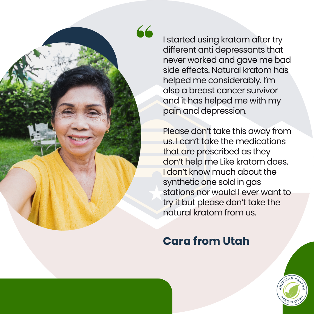 I started using kratom after try different anti depressants that never worked and gave me bad side effects. Natural kratom has helped me considerably. I’m also a breast cancer survivor and it has helped me with my pain and depression. Please don’t take this away from us. I can’t take the medications that are prescribed as they don’t help me Like kratom does. I don’t know much about the synthetic one sold in gas stations nor would I ever want to try it but please don’t take the natural kratom from us