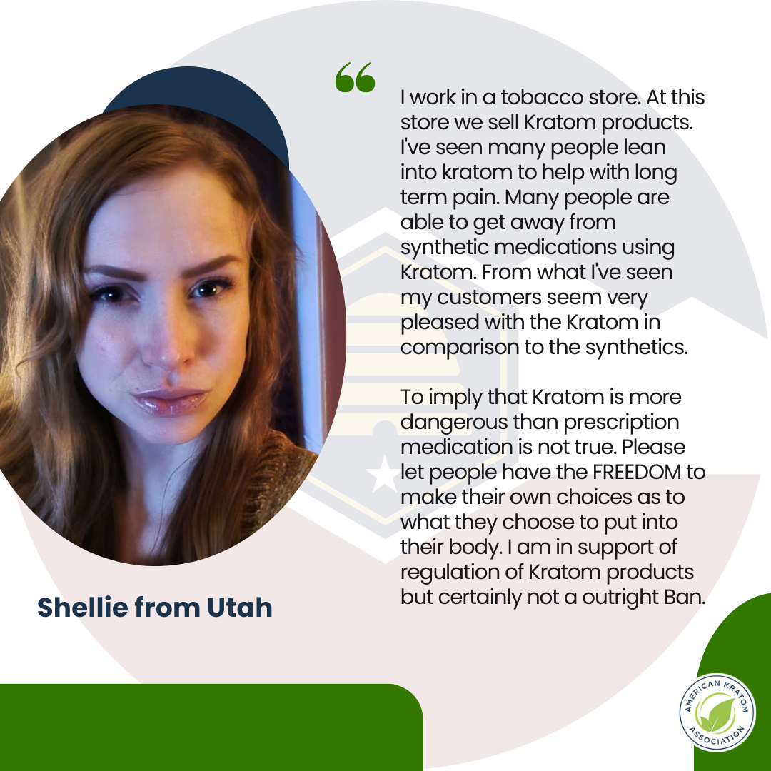 I work in a tobacco store. At this store we sell Kratom products. I've seen many people lean into kratom to help with long term pain. Many people are able to get away from synthetic medications using Kratom. From what I've seen my customers seem very pleased with the Kratom in comparison to the synthetics. To imply that Kratom is more dangerous than prescription medication is not true. Please let people have the FREEDOM to make their own choices as to what they choose to put into their body. I am in support of regulation of Kratom products but certainly not a outright Ban
