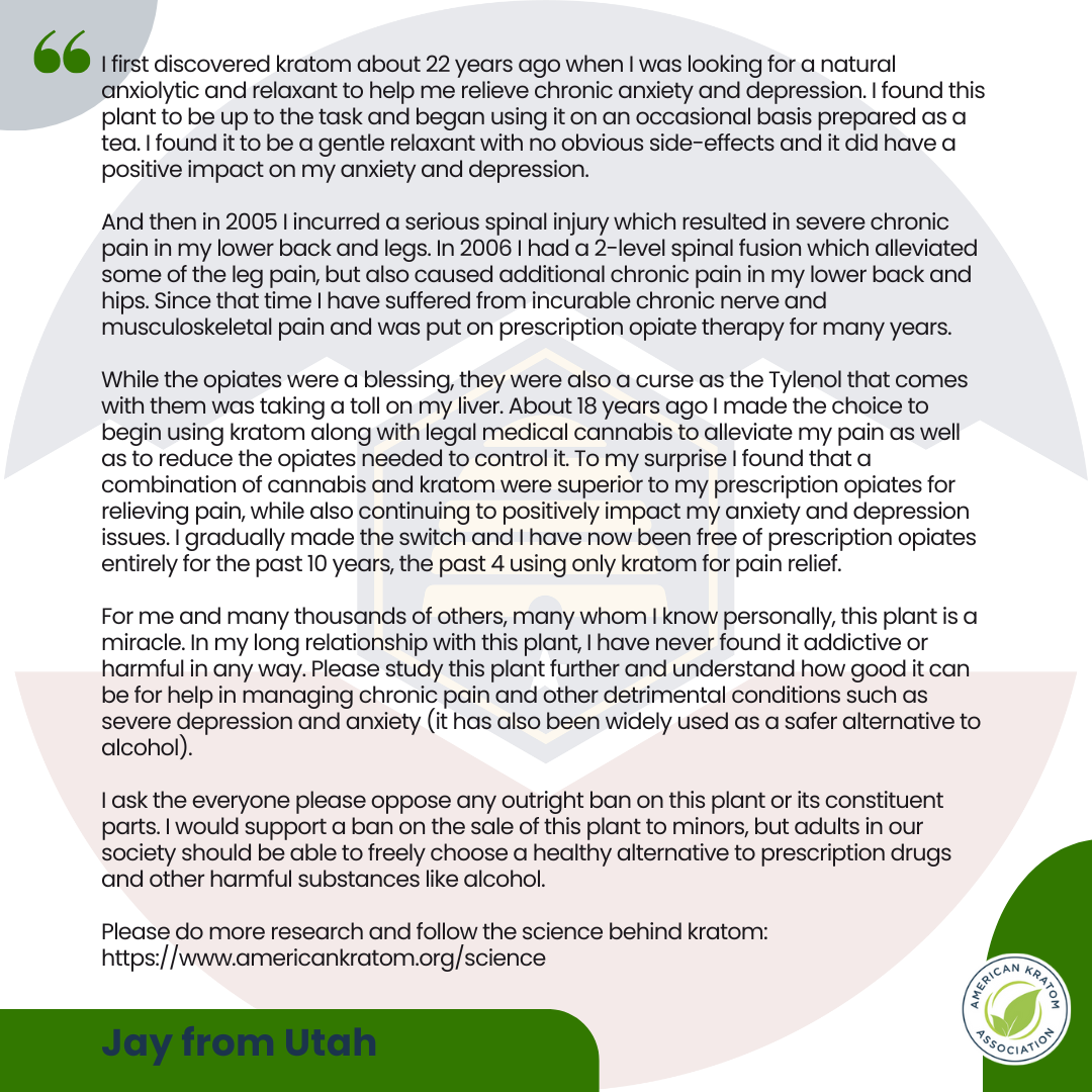 While the opiates were a blessing, they were also a curse as the Tylenol that comes with them was taking a toll on my liver. About 18 years ago I made the choice to begin using kratom along with legal medical cannabis to alleviate my pain as well as to reduce the opiates needed to control it. To my surprise I found that a combination of cannabis and kratom were superior to my prescription opiates for relieving pain, while also continuing to positively impact my anxiety and depression issues. I gradually made the switch and I have now been free of prescription opiates entirely for the past 10 years, the past 4 using only kratom for pain relief.