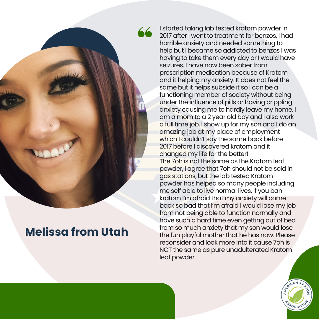 The 7oh is not the same as the Kratom leaf powder, I agree that 7oh should not be sold in gas stations, but the lab tested Kratom powder has helped so many people including me self able to live normal lives. If you ban kratom I’m afraid that my anxiety will come back so bad that I’m afraid I would lose my job from not being able to function normally and have such a hard time even getting out of bed from so much anxiety that my son would lose the fun playful mother that he has now. Please reconsider and look more into it cause 7oh is NOT the same as pure unadulterated Kratom leaf powder