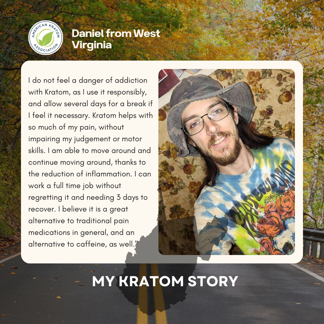 Daniel from West Virginia"Keeping Kratom safe is important to me because I have virtually nothing else for everyday chronic osteoarthritis pains and sciatica symptoms. I am allergic to aspirin and nSAIDs, including ibuprofen, acetaminophen, and naproxen. I don't trust traditional opioid pain medications, because I have a past with alcoholism, and am afraid I would get addicted to pills. I do not feel a danger of addiction with Kratom, as I use it responsibly, and allow several days for a break if I feel it necessary. Kratom helps with so much of my pain, without impairing my judgement or motor skills. I am able to move around and continue moving around, thanks to the reduction of inflammation. I can work a full time job without regretting it and needing 3 days to recover. I believe it is a great alternative to traditional pain medications in general, and an alternative to caffeine, as well."